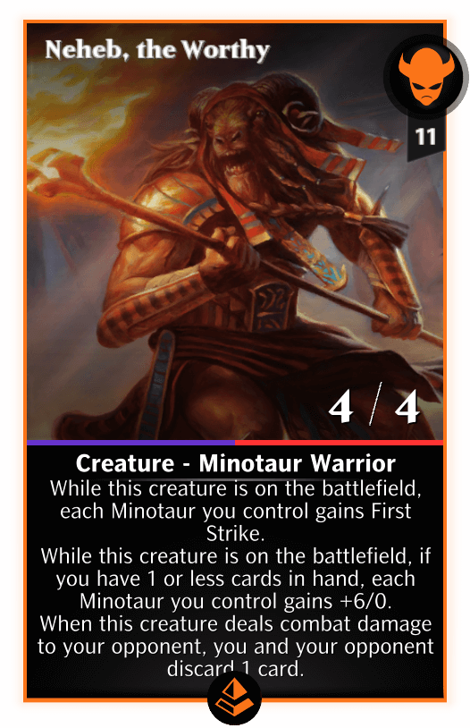 While this creature is on the battlefield, if you have 1 or less cards in hand, each Minotaur you control gains +6/0.