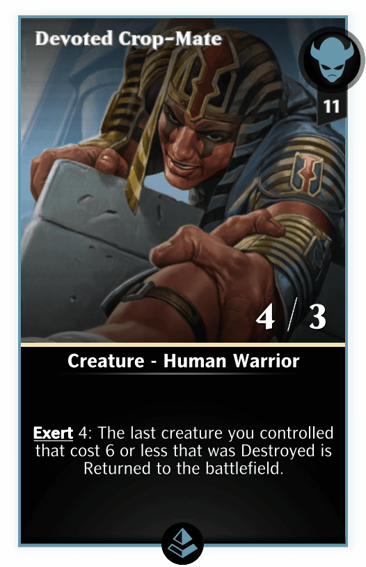 Exert 4: The last creature you controlled that cost 6 or less that was Destroyed is Returned to the battlefield.