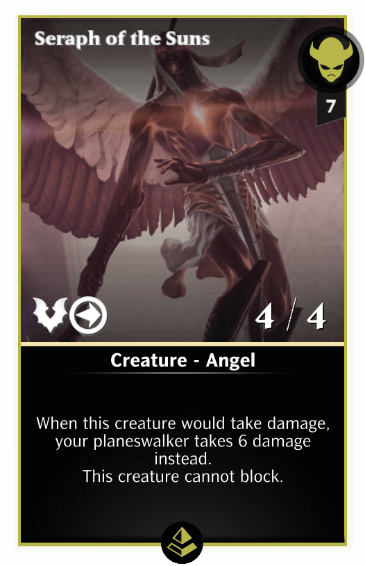 When this creature would take damage, your planeswalker takes 6 damage instead.
