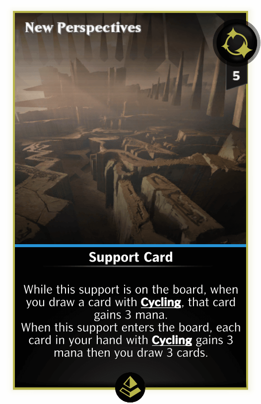 When this support enters the board, each card in your hand with Cycling gains 3 mana then you draw 3 cards.