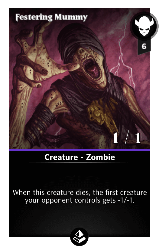 When this creature dies, the first creature your opponent controls gets -1/-1.