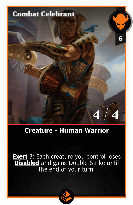 Exert 3: Each creature you control loses Disabled and gains Double Strike until the end of your turn.