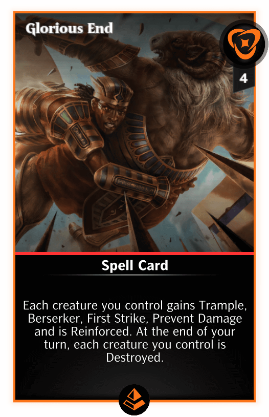 Each creature you control gains Trample, Berserker, First Strike, Prevent Damage and is Reinforced. At the end of your turn, each creature you control is Destroyed.