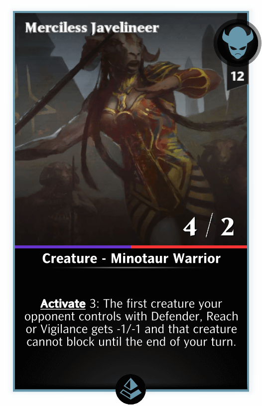 Activate 3: The first creature your opponent controls with Defender, Reach or Vigilance gets -1/-1 and that creature cannot block until the end of your turn.