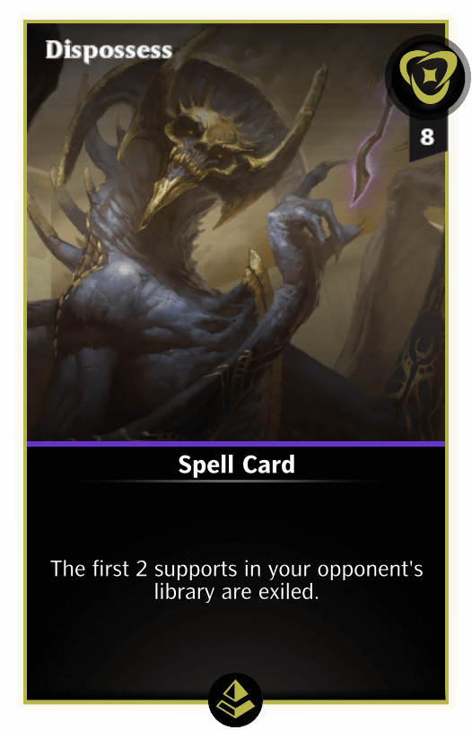 If your opponent has 5 or less cards in hand, target creature your opponent controls is Returned to their hand, then the top 2 cards in each player’s library are Destroyed.
