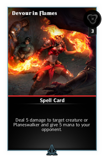 Deal 5 damage to target creature or Planeswalker and give 5 mana to your opponent.