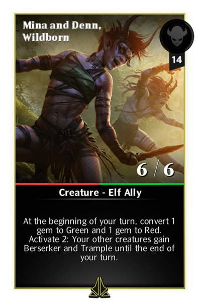 At the beginning of your turn, convert 1 gem to Green and 1 gem to Red.