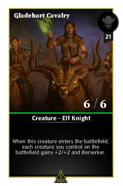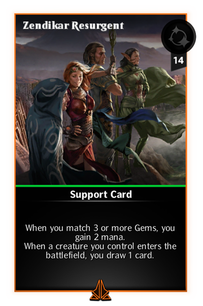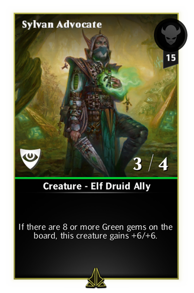 If there are 8 or more Green gems on the board, this creature gains +6/+6.