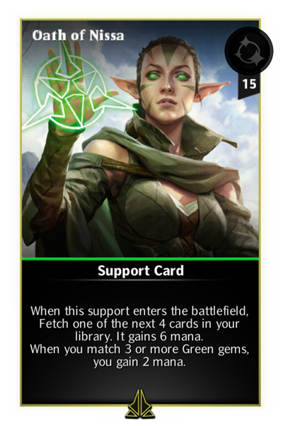 When this support enters the battlefield, Fetch one of the next 4 cards in your library. It gains 6 mana.