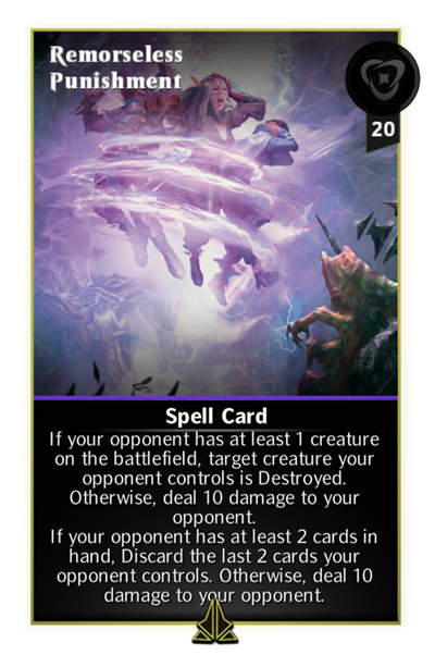 If your opponent has at least 2 cards in hand, Discard the last 2 cards your opponent controls. Otherwise, deal 10 damage to your opponent.