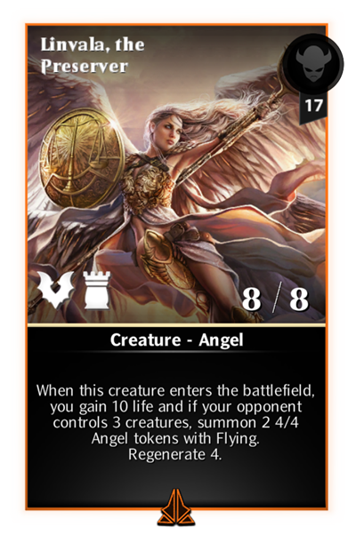 When this creature enters the battlefield, you gain 10 life and if your opponent controls 3 creatures, summon 2 4/4 Angel tokens with Flying.