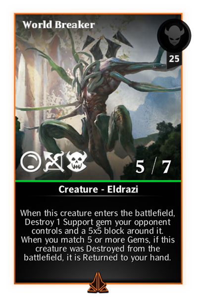 When this creature enters the battlefield, Destroy 1 Support gem your opponent controls and a 5×5 block around it.