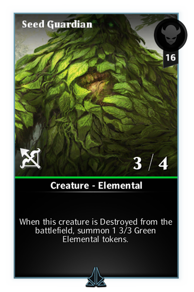 When this creature is Destroyed from the battlefield, summon 1 3/3 Green Elemental tokens.