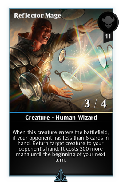 When this creature enters the battlefield, if your opponent has less than 6 cards in hand, Return target creature to your opponent’s hand. It costs 300 more mana until the beginning of your next turn.