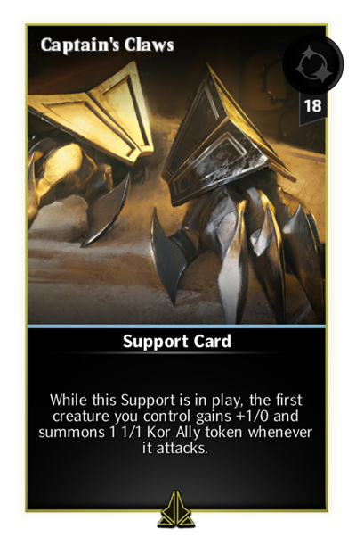 While this Support is in play, the first creature you control gains +1/0 and summons 1 1/1 Kor Ally token whenever it attacks.