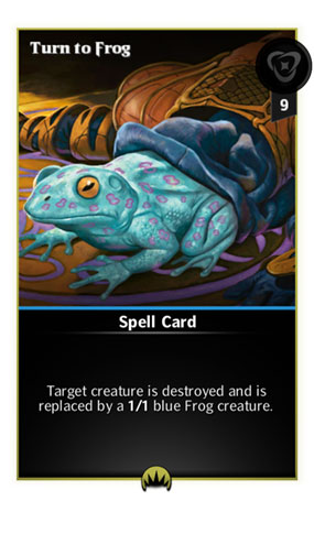 Target creature is destroyed and is replaced by a 1/1 blue Frog creature.