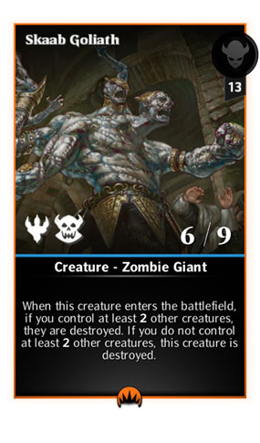 When this creature enters the battlefield, if you control at least 2 other creatures, they are destroyed. If you do not control at least 2 other creatures, this creature is destroyed.