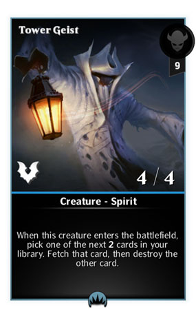 When this creature enters the battlefield, pick one of the next 2 cards in your library. Draw that card, then destroy the other card.