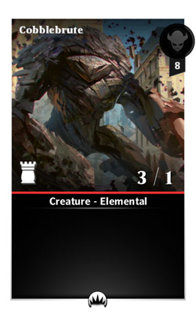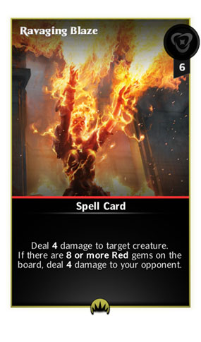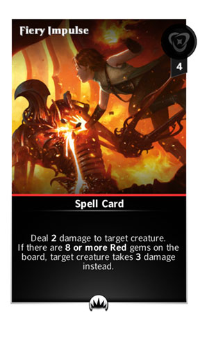 If there are 8 or more Red gems on the board, target creature takes 3 damage instead.