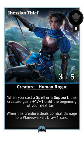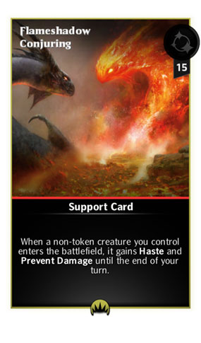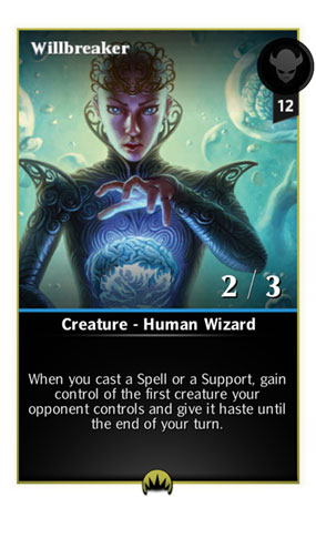 When you cast a Spell or a Support gain control of the first creature your opponent controls and give it haste until the end of your turn.