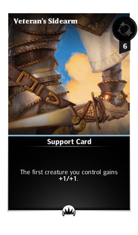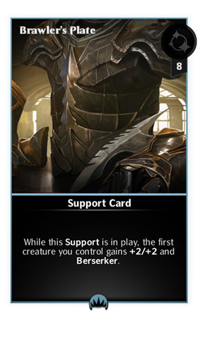 While this Support is in play, the first creature you control gains +2/+2 and Berserker.