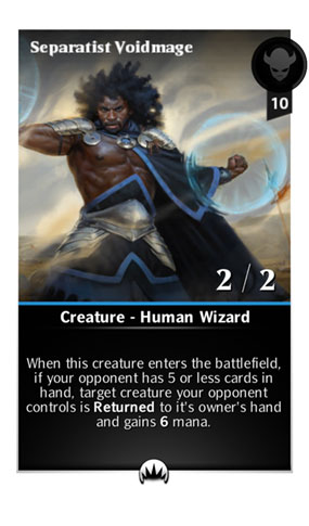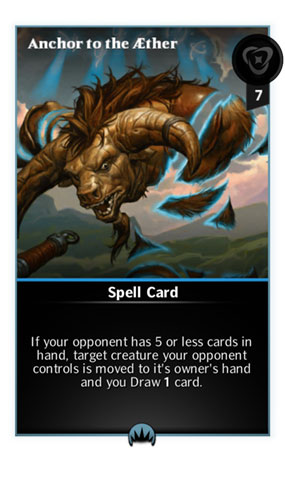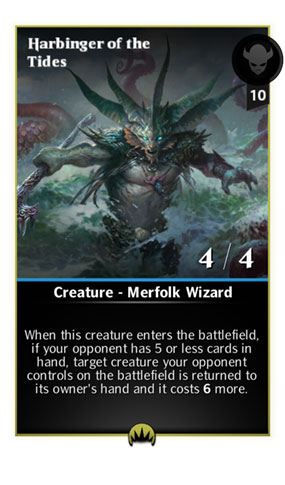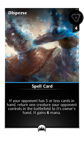 If your opponent has 5 or less cards in hand, return one creature your opponent controls in the battlefield to it’s owner’s hand. It gains 6 mana.