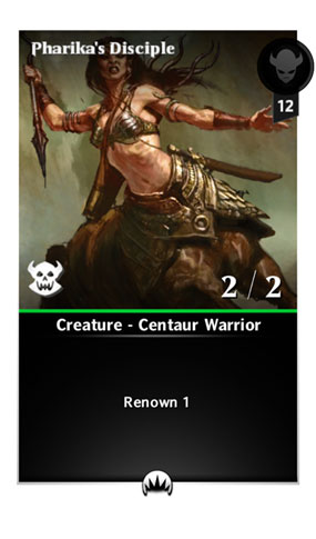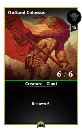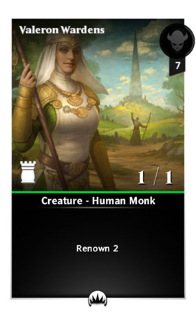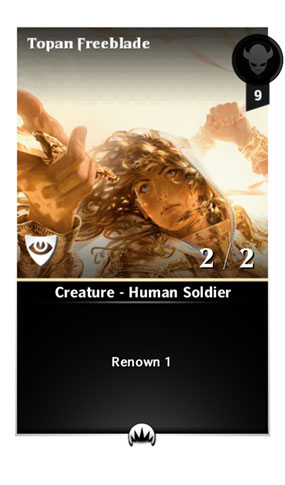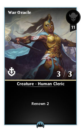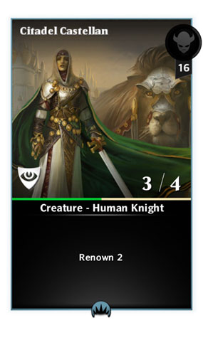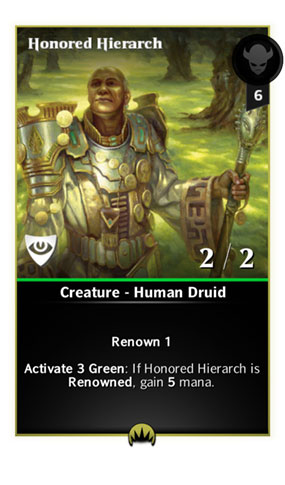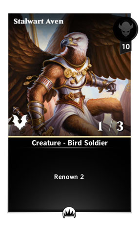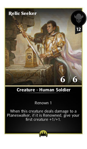 Renown 1 When this creature deals damage to a Planeswalker, if it is Renowned, give your first creature +1/+1.
