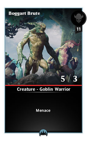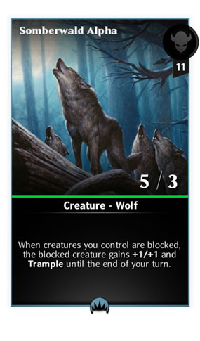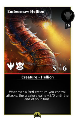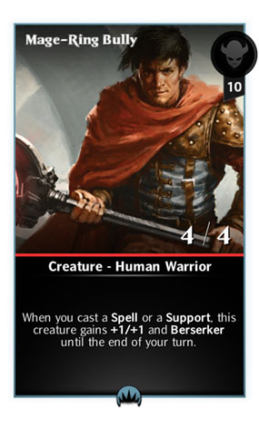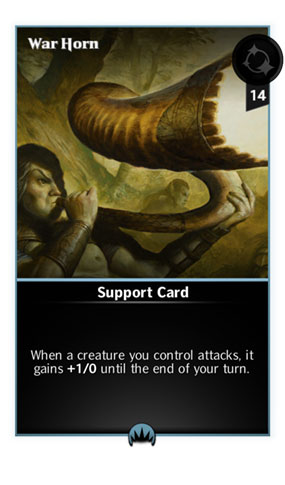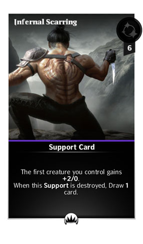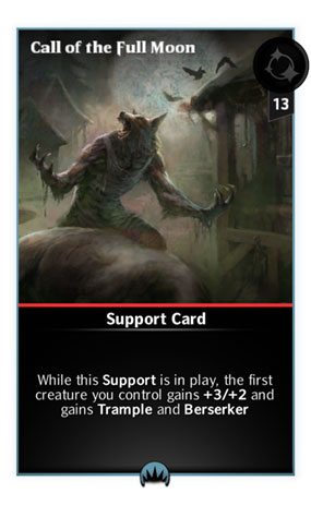 While this Support is in play, the first creature you control gains 3/2 and gains Trample and Berserker
