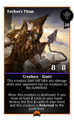 When this creature is destroyed, if you have at least 2 cards in your hand, destroy the first 2 cards in your hand and this creature is Returned to the battlefield.