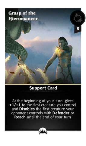 At the beginning of your turn, gives +1/+1 to the first creature you control and Disables the first creature your opponent controls with Defender or Reach until the end of your turn