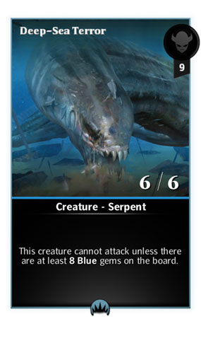 This creature cannot attack unless there are at least 8 Blue gems on the board.