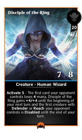 Activate 5 : The first card your opponent controls loses 4 mana, Disciple of the Ring gains +4/+4 until the beginning of your next turn and the first creature with Defender or Reach your opponent controls is Disabled until the end of your turn.