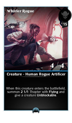When this creature enters the battlefield, summon 2 1/1 Thopter with Flying and give a creature Unblockable.