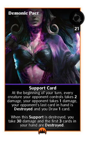 When this Support is destroyed, you take 30 damage and the first 2 cards in your hand are Destroyed.