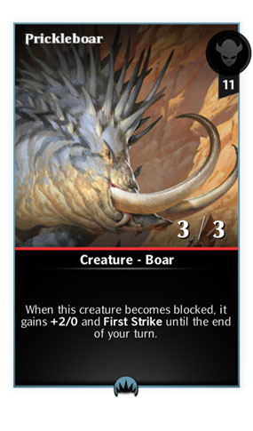 When this creature becomes blocked, it gains +2/0 and First Strike until the end of your turn.