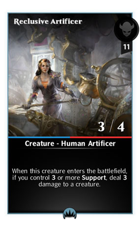 When this creature enters the battlefield, if you control 3 or more Support deal 3 damage to a creature.
