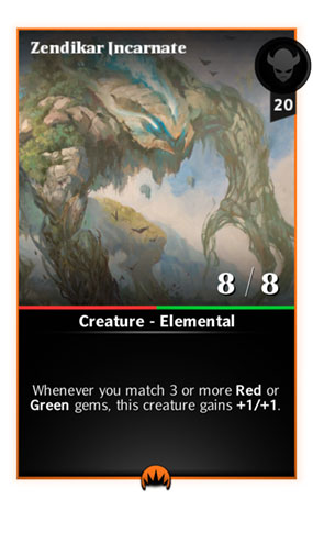 Whenever you match 3 or more Red or Green gems, this creature gains +1/+1.