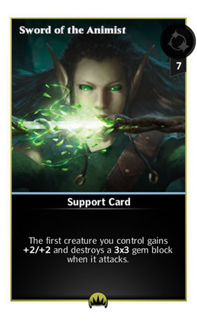 The first creature you control gains +2/+2 and destroys a 3×3 gem block when it attacks.