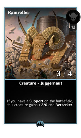 If you have a Support on the battlefield, this creature gains +2/0 and Berserker.