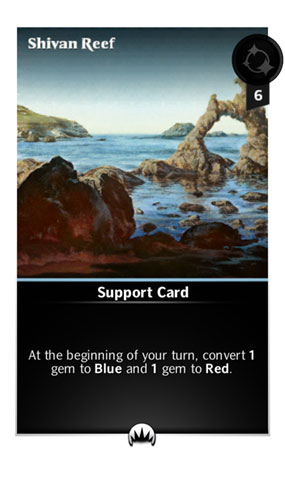 At the beginning of your turn, convert 1 gem to Blue and 1 gem to Red.