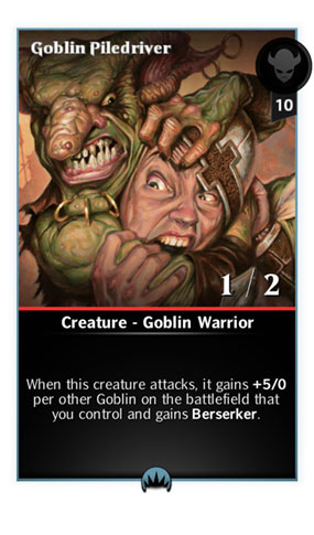 When this creature attacks, it gains +5/0 per other Goblin on the battlefield that you control and gains Berserker.