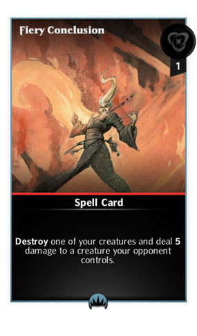 Destroy one of your creatures and deal 5 damage to a creature your opponent controls.